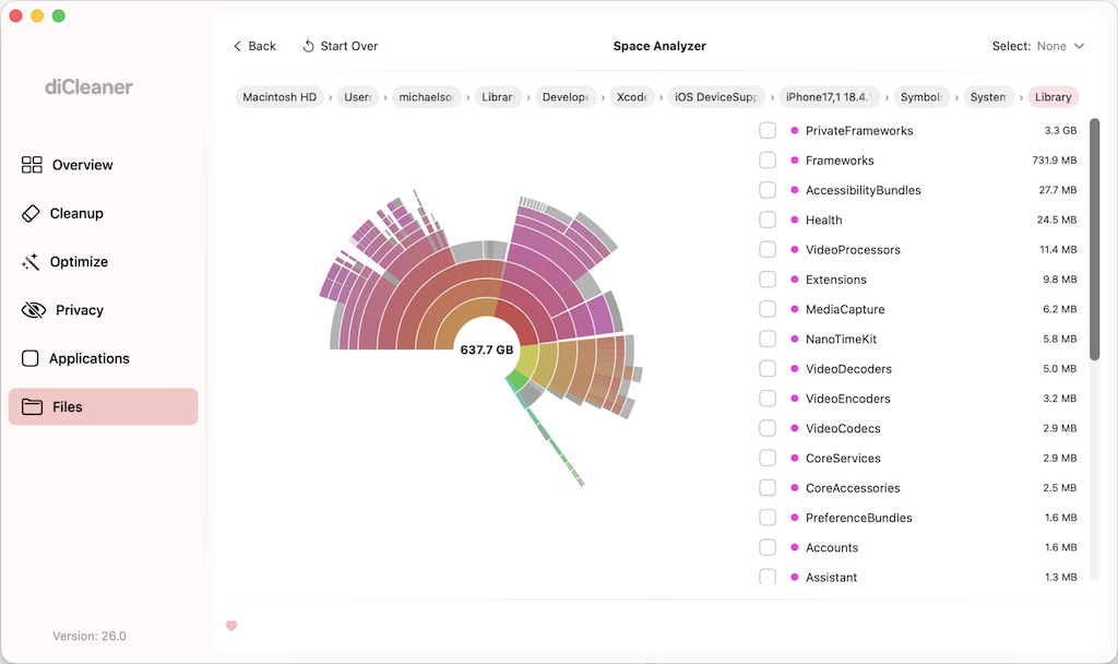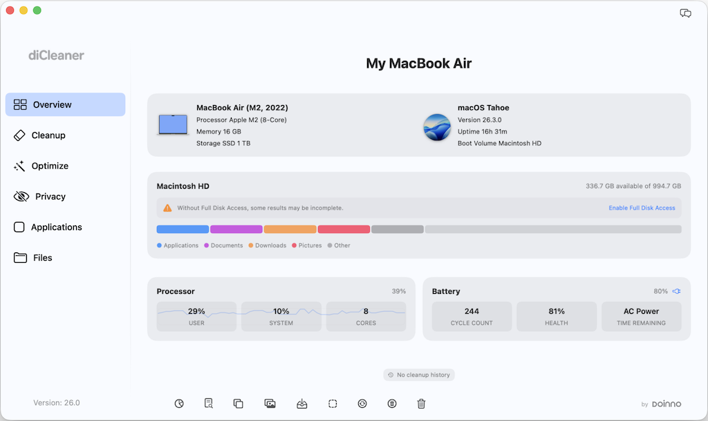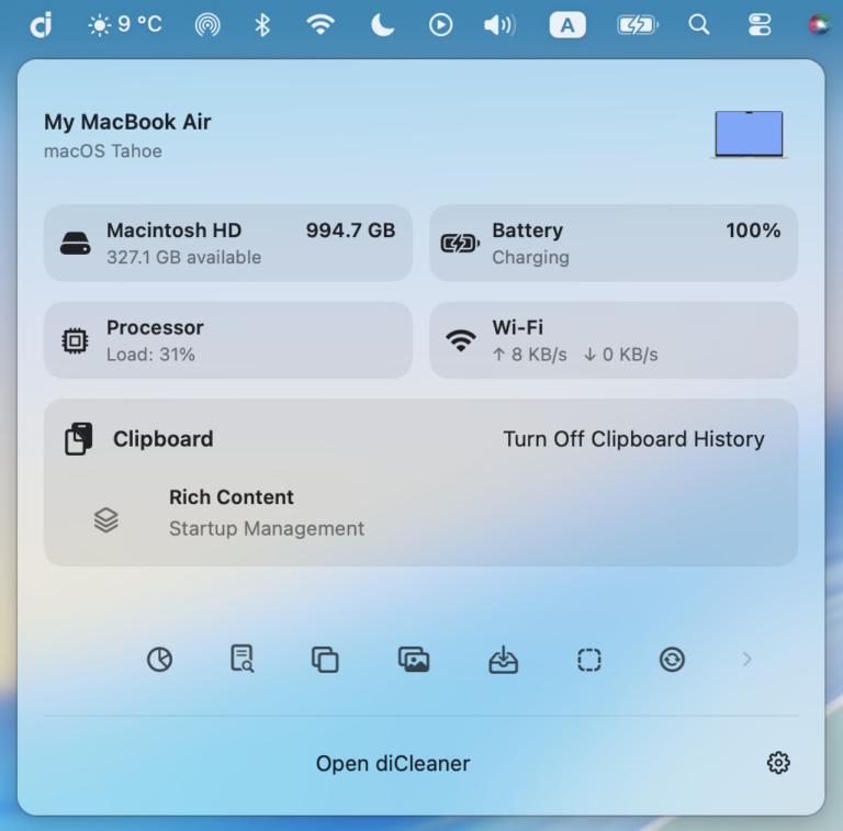 diCleaner brings clarity and control to your Mac. It helps you review and remove unnecessary files, check startup items, and keep your system organized and responsive. Explore your storage, find duplicates, review large or aging files, organize downloads, detect similar photos, and keep apps up to date — all in one thoughtfully designed utility that helps your Mac stay clean, efficient, and easy to manage.