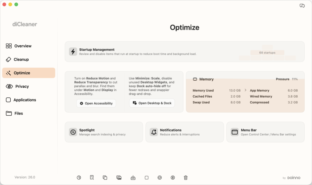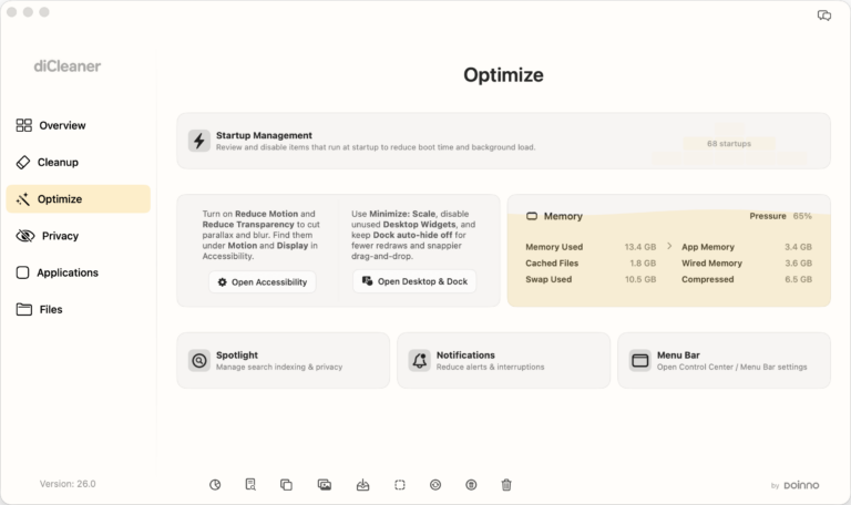Fine-tune how your Mac runs. Manage startup items, review memory usage, and close resource-intensive applications when needed. Access key system settings — such as Reduce Motion, Reduce Transparency, Spotlight, Notifications, and Menu Bar preferences — to adjust visual effects and background activity for a more responsive experience.