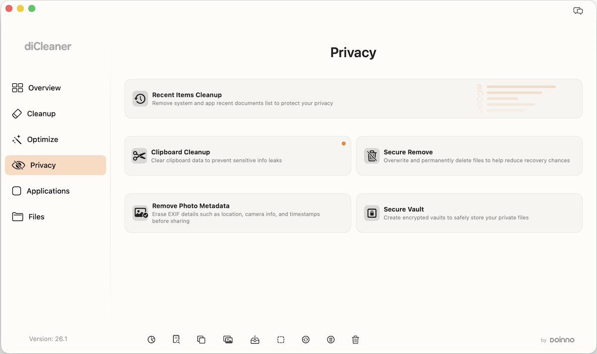Manage your digital traces with intention. Review and clear recent activity, clean clipboard history, remove sensitive photo metadata, securely shred files, and store important documents in encrypted vaults. Each tool is designed to help you protect personal information and maintain greater control over your privacy.
